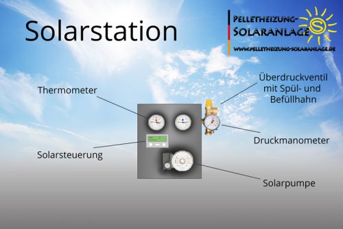 Eine Solarstation beinhaltet in der Regel die Solarpumpe, Sicherheitsventile und die Spül- und Befüllhähne, die Schwerkraftbremse sowie verschiedene Konstrollinstrumente und Sensoren wie Thermometer, Manometer, und Durchflusssensoren. Oft ist in die Solarstationen auch der Solarregler direkt in das Gehäuse integriert. In jedem Fall sollte die Solarstation in eine Dämmschale eingehüllt sein, um Energieverluste zu vermeiden.